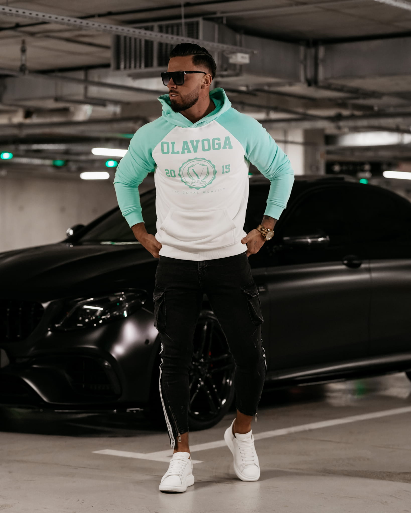 Delikatnie oversizowa bluza, klasyczny krój kangurki. Posiada kaptur oraz prążkowane ściągacze na brzegach produktu. Na przodzie ciekawy print oraz obszerne logo marki z minimalistycznym THE ROYAL QUALITY. Rękawy i kaptur w kontrastowych odcieniach.