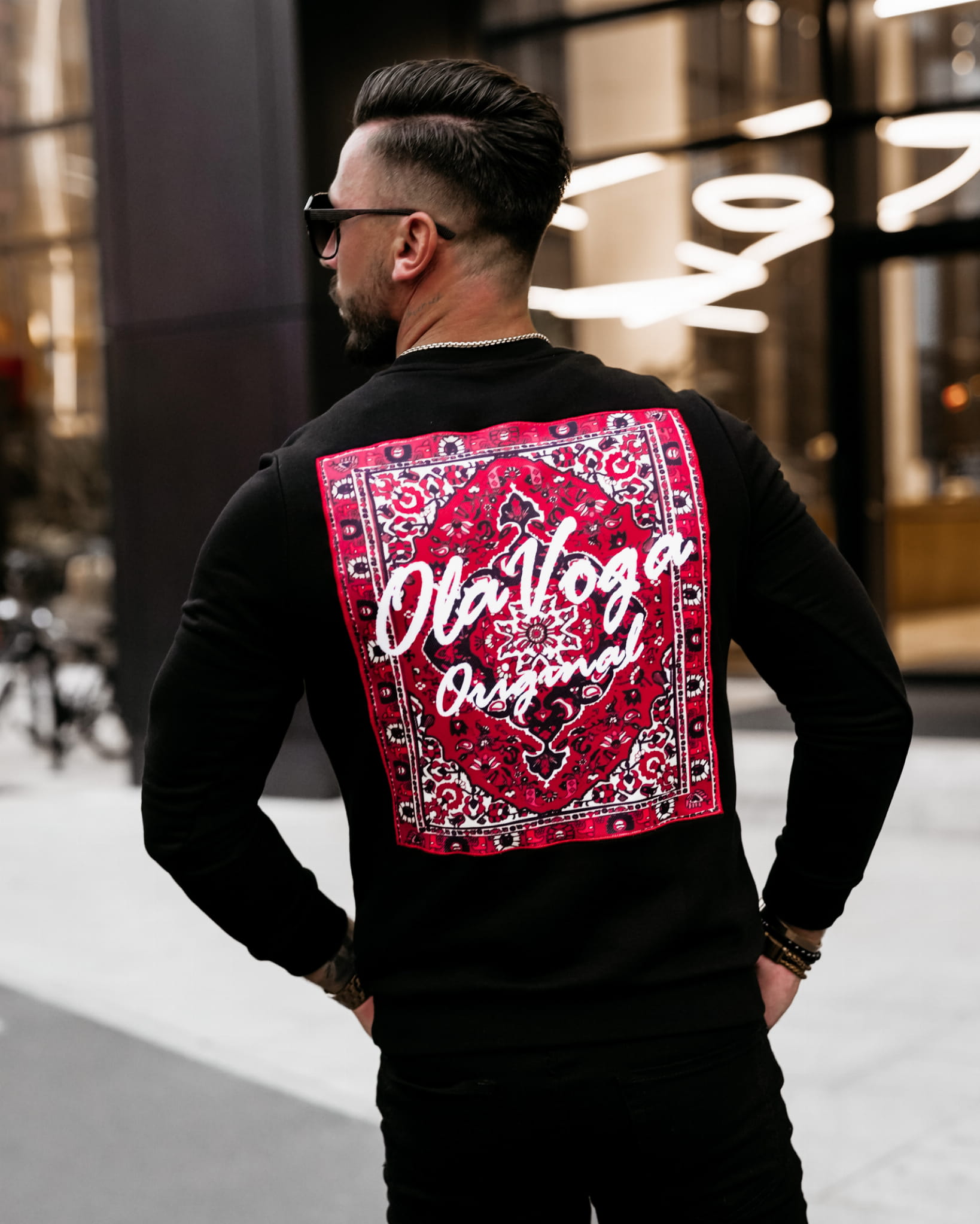 Dopasowana męska bluza z długim rękawem, z napisem 3d na przodzie. Na plecach duża kontrastowa aplikacja. Brzegi i rękawy wykończone ściągaczem.