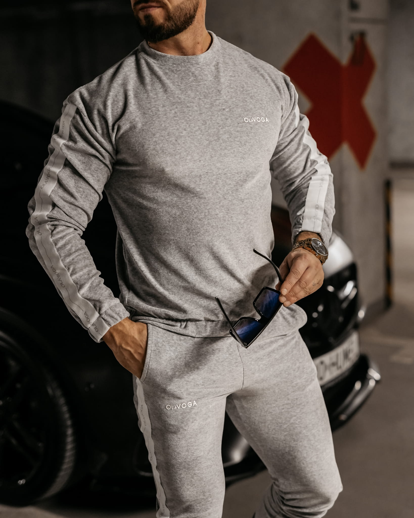 Welurowy, sportowy komplet uszyty z miękkiego weluru. Po boku znajdują się ozdobne taśmy z logo naszej marki. Na przodzie delikatny haft.