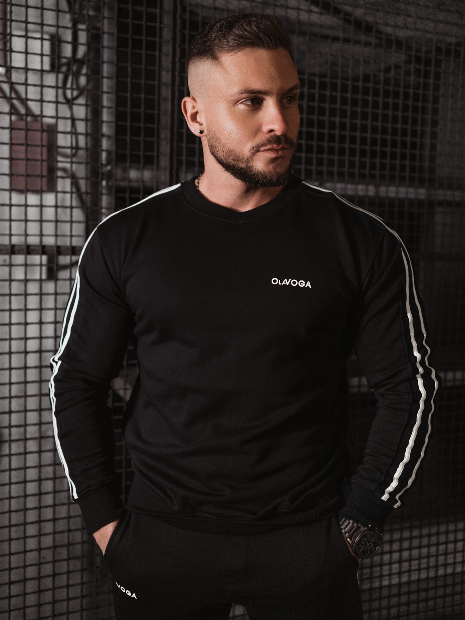 Sportowy komplet uszyty z wysokogatunkowej bawełny. Na brzegach posiada ściągacze. Po boku ozdobne lampasy. Delikatne przeszycia na bluzie. Na przodzie kompletu znajduje się minimalistyczne logo marki.